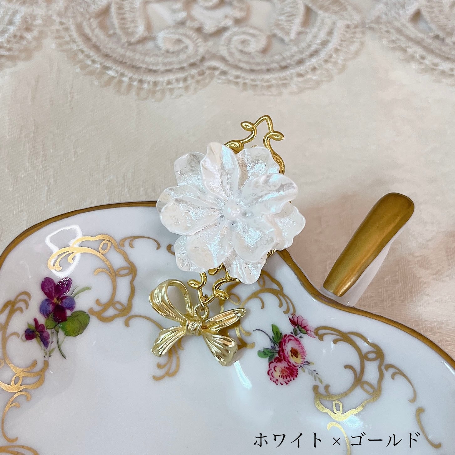 一輪の白い花をリボンで結んだような可憐なリングです。