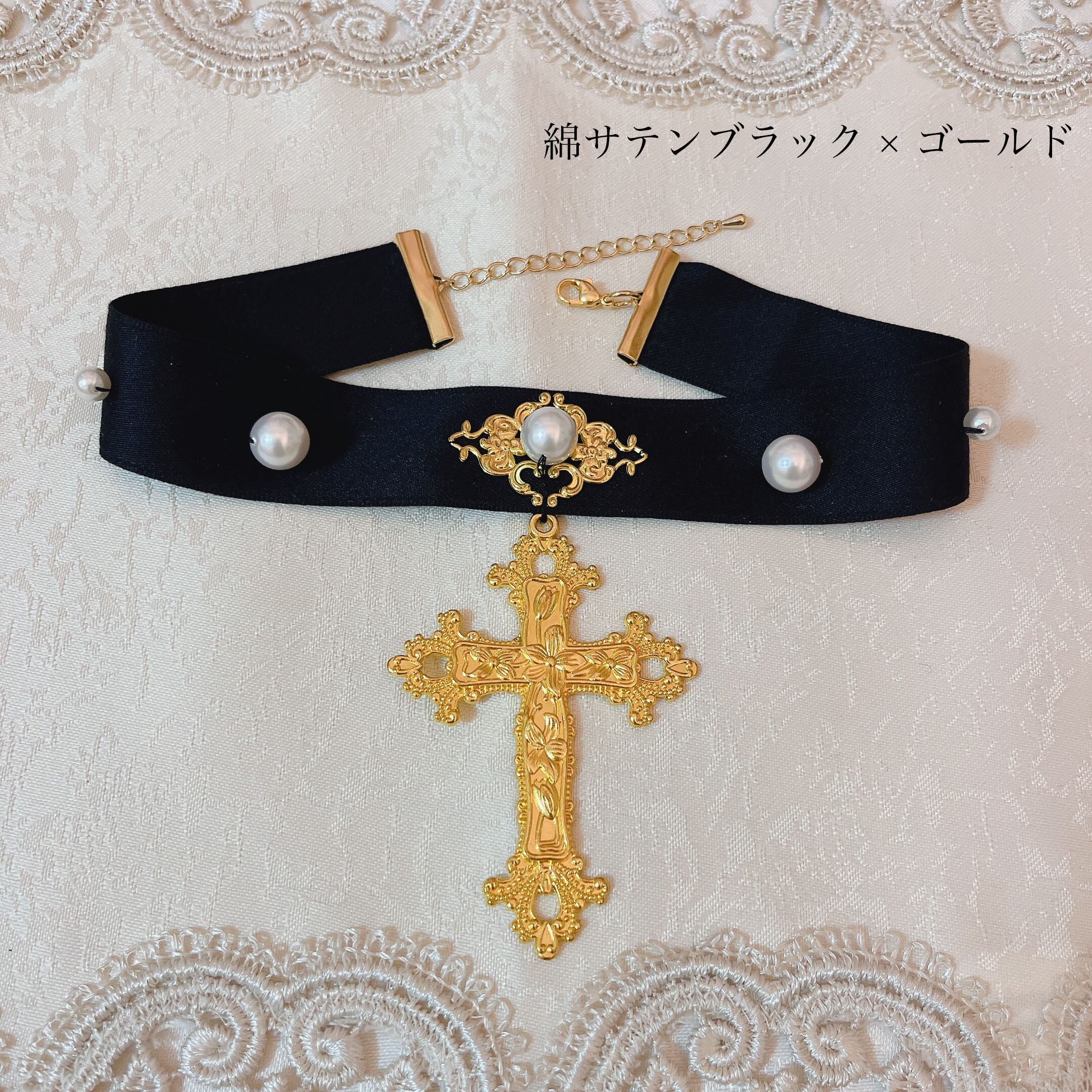 大きな十字架にパールを沢山あしらったノーブルなデザイン。